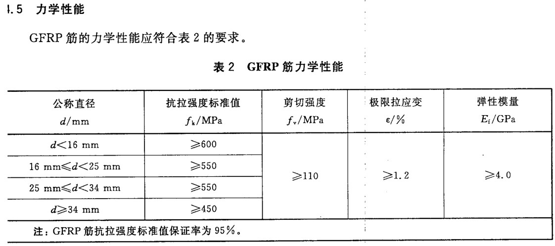 抗拉強(qiáng)度標(biāo)準(zhǔn)值不應(yīng)小于500Mpa,抗拉強(qiáng)度設(shè)計(jì)值應(yīng)不小于350Mpa,彈性模量不小于34Gpa。