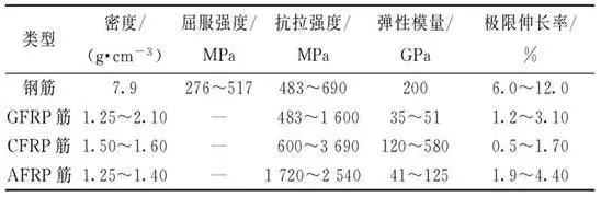 在處于惡劣環(huán)境條件時,如干濕交替、化學(xué)介質(zhì)等作用下,普通鋼筋極易發(fā)生腐蝕,嚴(yán)重影響結(jié)構(gòu)的耐久性和適用性,導(dǎo)致結(jié)構(gòu)承載能力的降低。在這種情況下,防腐性能好、黏結(jié)性能與鋼筋相差不多且抗拉強(qiáng)度高的FRP筋成為代替鋼筋的一個較好選擇(表1)。